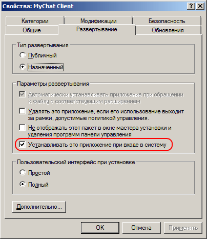 Пользователи, которые входят в подразделения с данной ГП, после перезагрузки при обновлении политики выполнят условия установки и настройки MyChat Client.